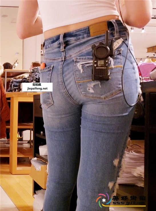 服装店蓝色紧牛美腿饱满翘臀金发美眉[MP4/917M]