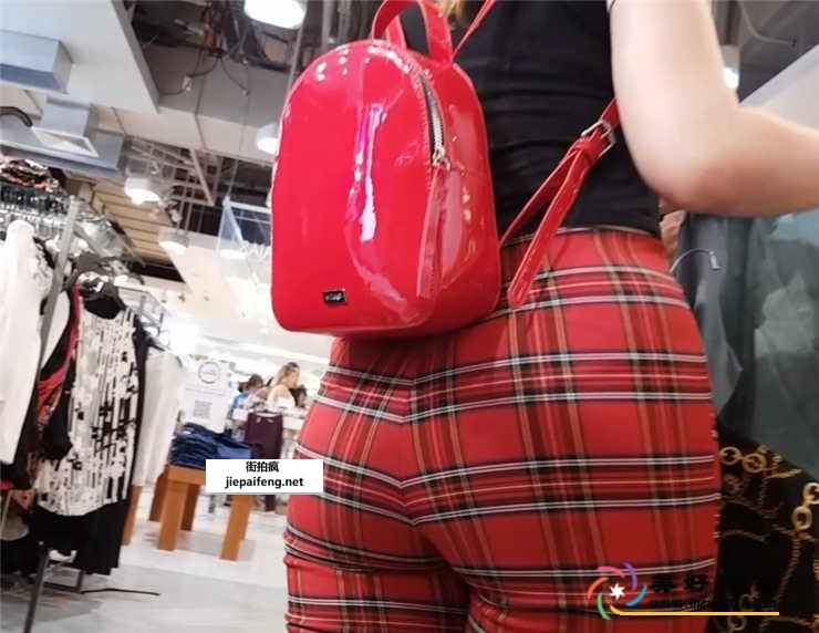 买衣服的红色格子紧绷长裤洋妞圆润大屁股[MP4/111M]