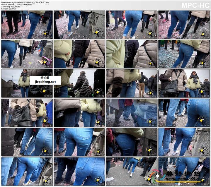 街拍蓝色紧身牛仔裤洋妞性感饱满圆润大屁股[MP4/699M]