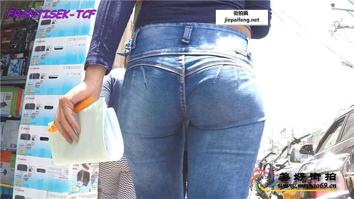 街拍蓝色紧身牛仔裤高挑洋妞极品性感翘臀[MP4/416M]