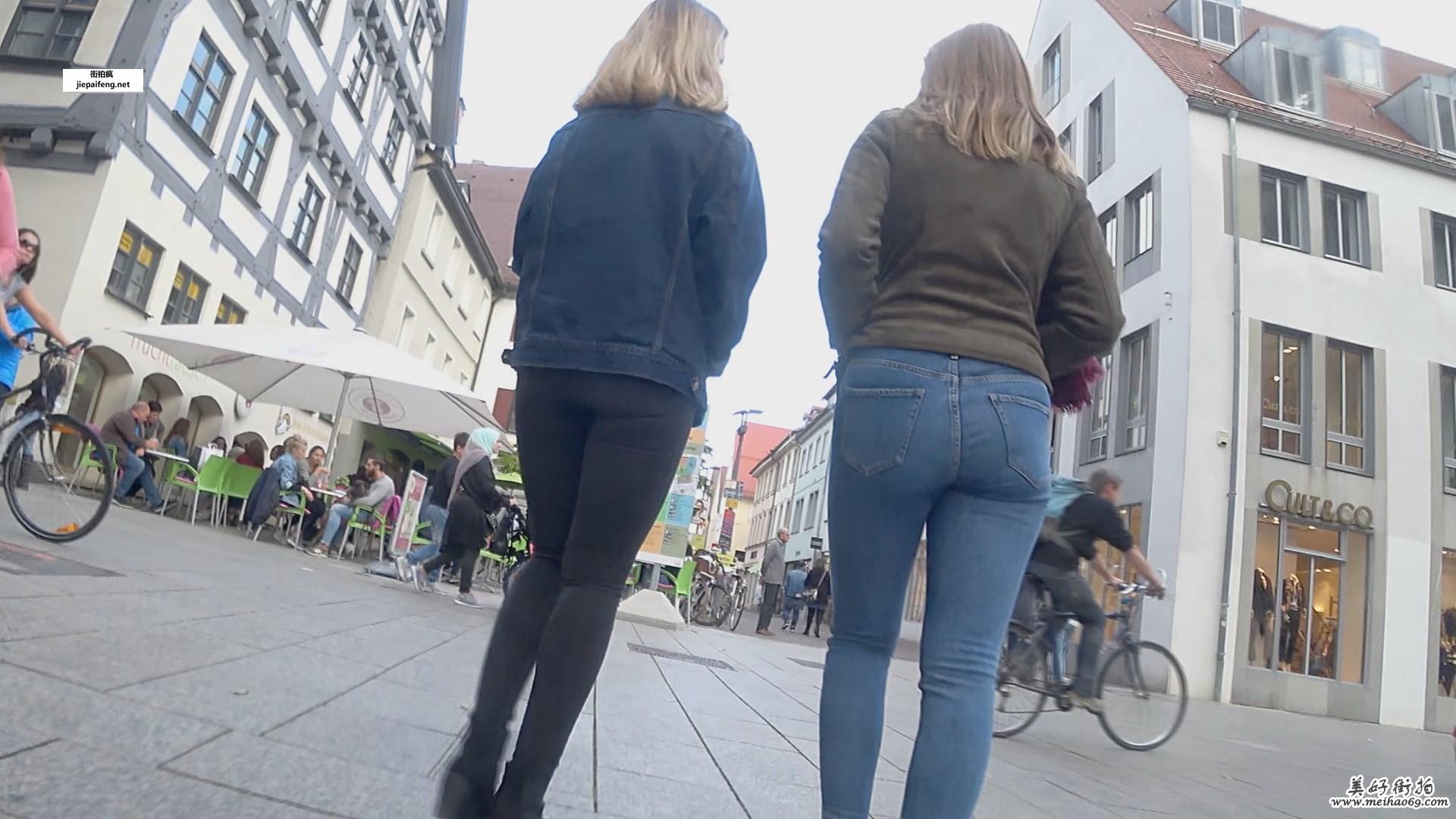 街拍黑色和蓝色紧身牛仔裤两个洋妞性感圆润翘臀[MP4/282M]
