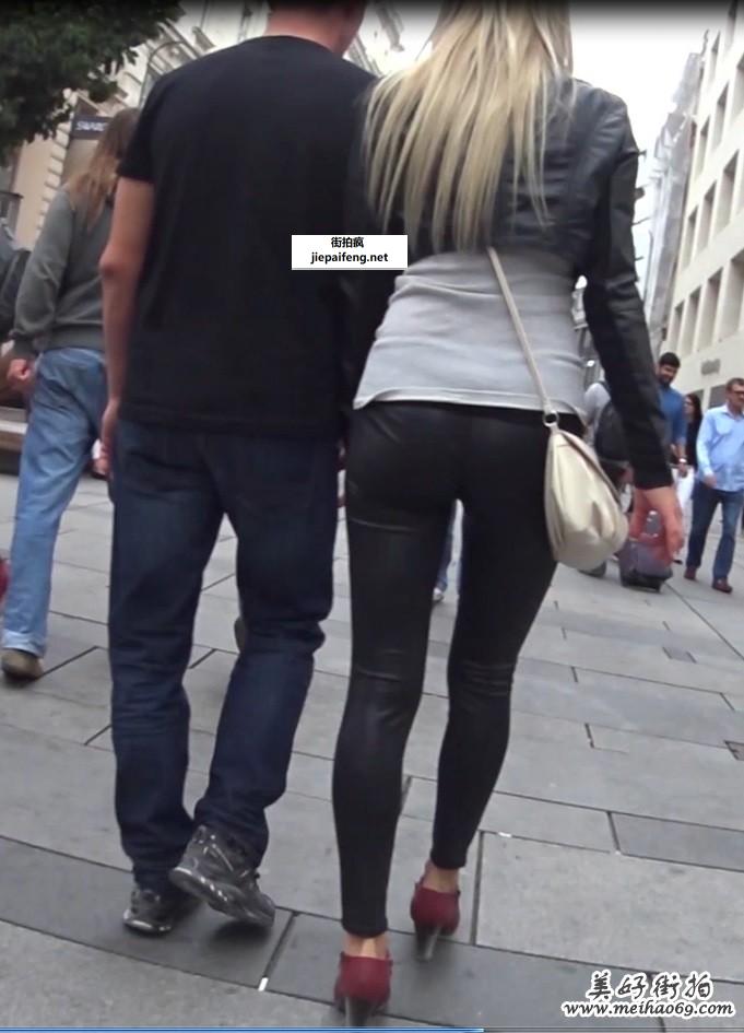 街拍黑色紧身皮裤金发少妇性感身材圆润翘臀[MP4/847M]