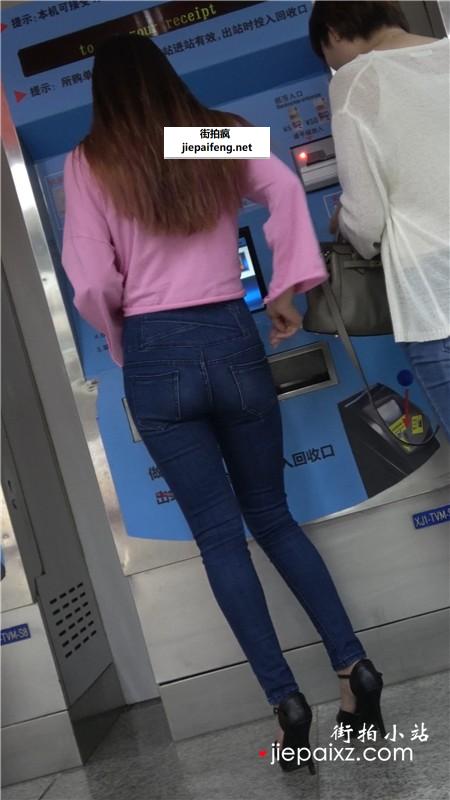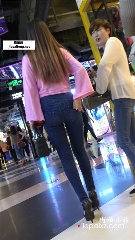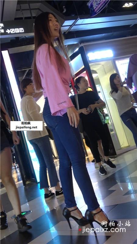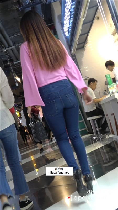 4K -粉色T恤衫紧身蓝色牛仔裤街拍极品身材高跟鞋美女[918 MB]