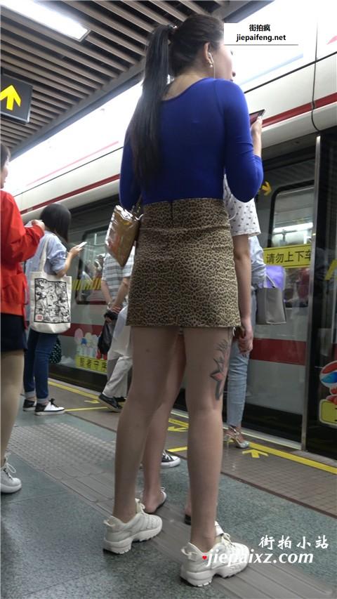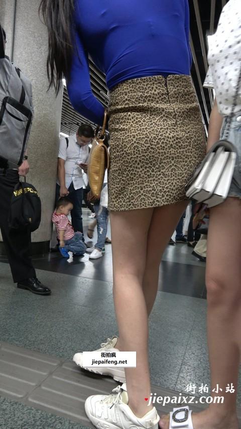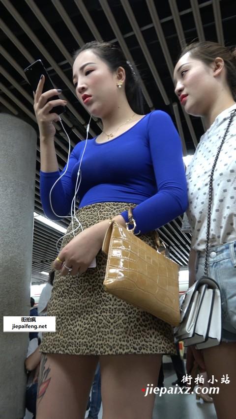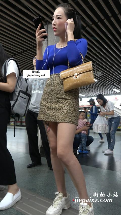 4K 蓝色紧身T恤豹纹短裙街拍美女