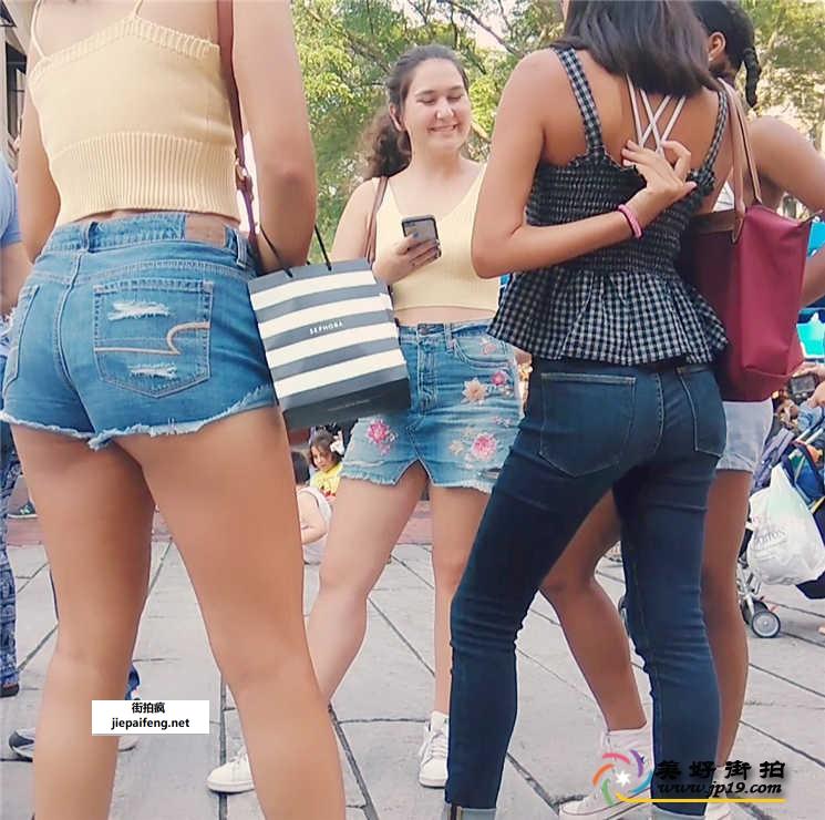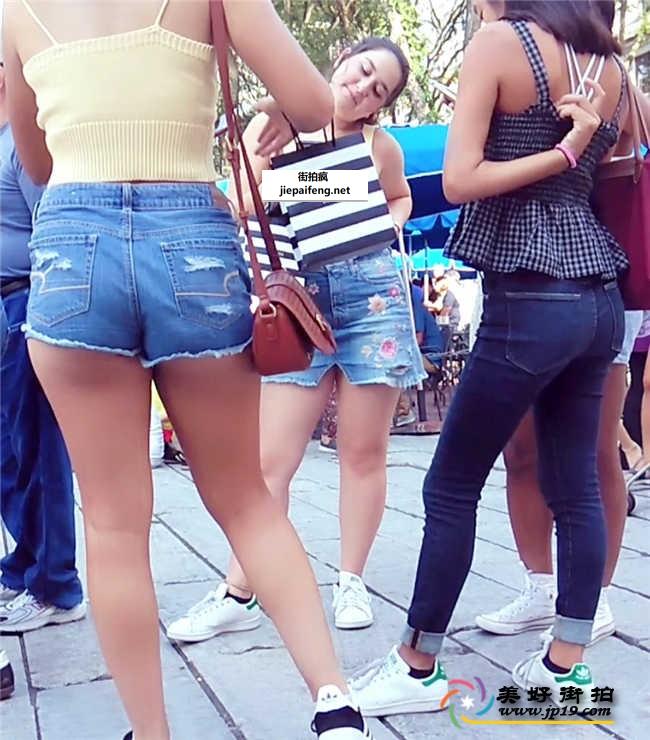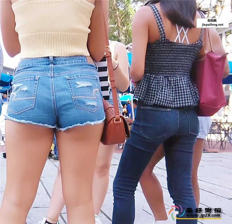街拍蓝色牛仔热裤饱满圆润大臀洋妞[MP4/718M]