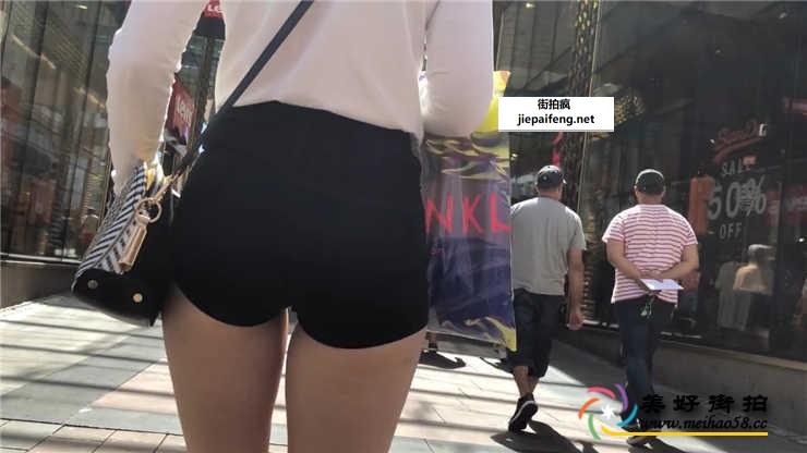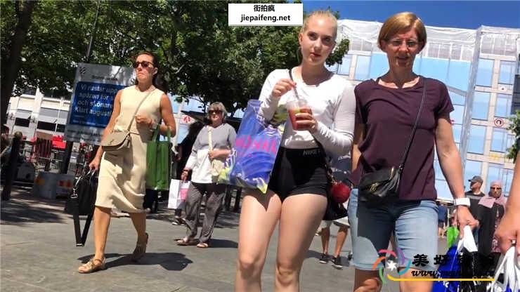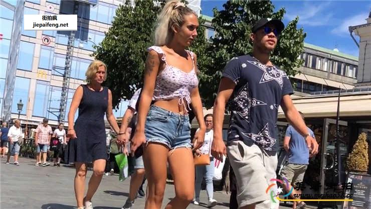 街拍黑色紧绷牛仔热裤金发美眉性感白腿美臀[MP4/254M]