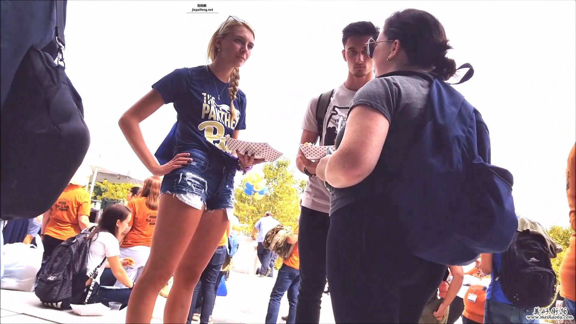 街拍蓝色紧绷牛仔热裤金发长腿洋妞性感圆润翘臀[MP4/382M]