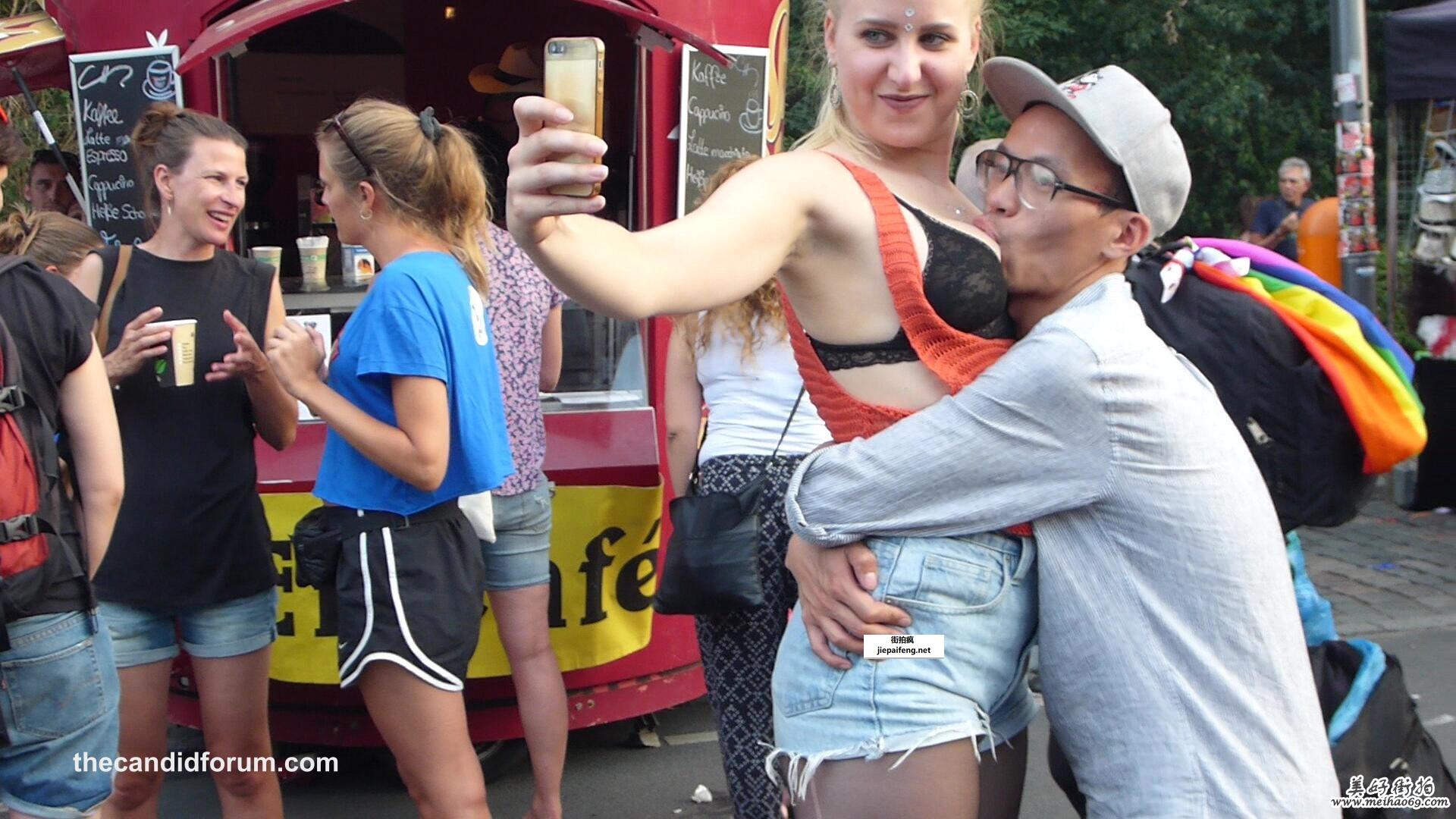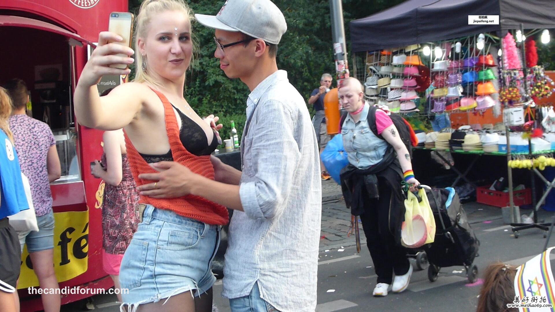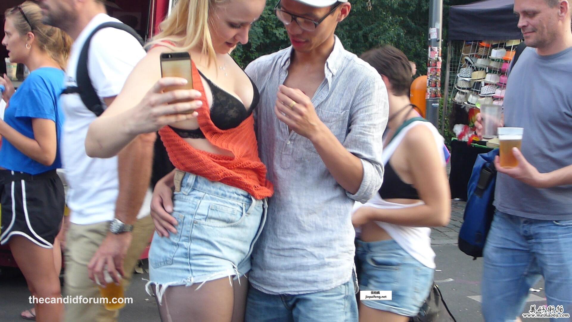 街拍牛仔热裤金发白肤洋妞诱人双乳[MP4/218M]