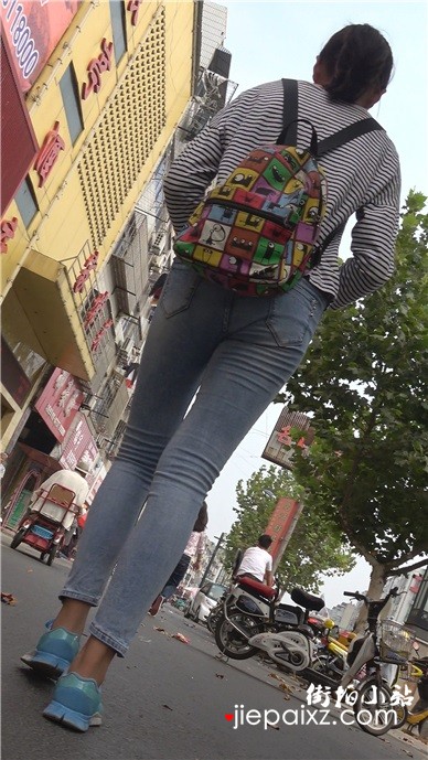 蓝色紧身蜜桃臀牛仔裤美眉