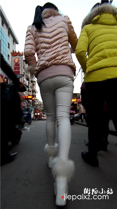 街拍长腿紧身白裤粉色毛毛鞋美眉
