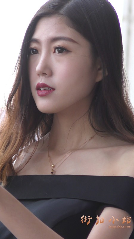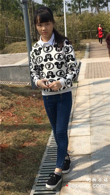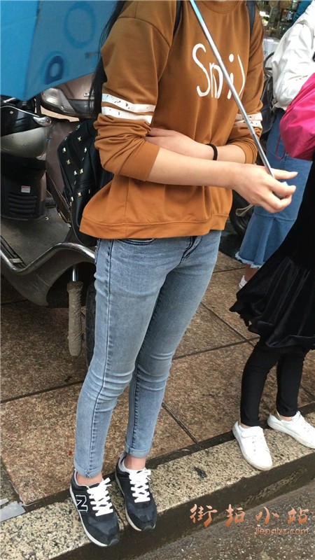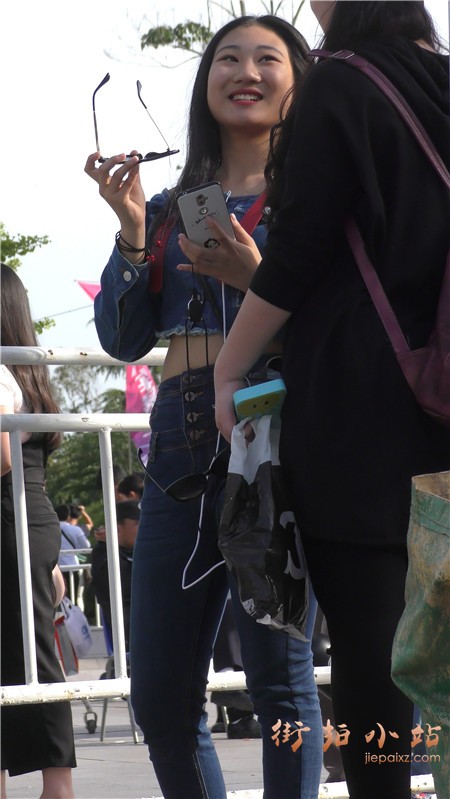 超紧身蓝色牛仔裤黑T恤街拍美女
