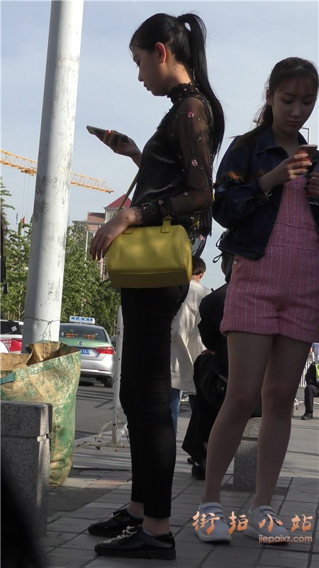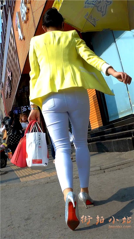 街拍紧身白裤高跟鞋黄色小外套美妇