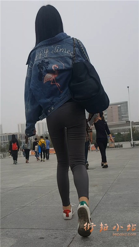 街拍牛仔外套灰色紧身裤美女小姐姐
