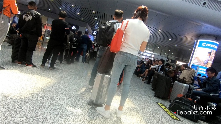 超级紧身蓝色牛仔裤美眉候车室等车