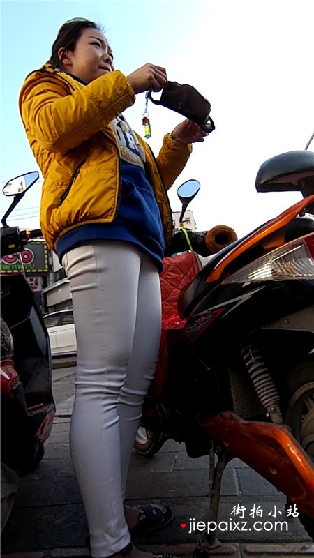 街拍紧身白裤骑电动车的女孩