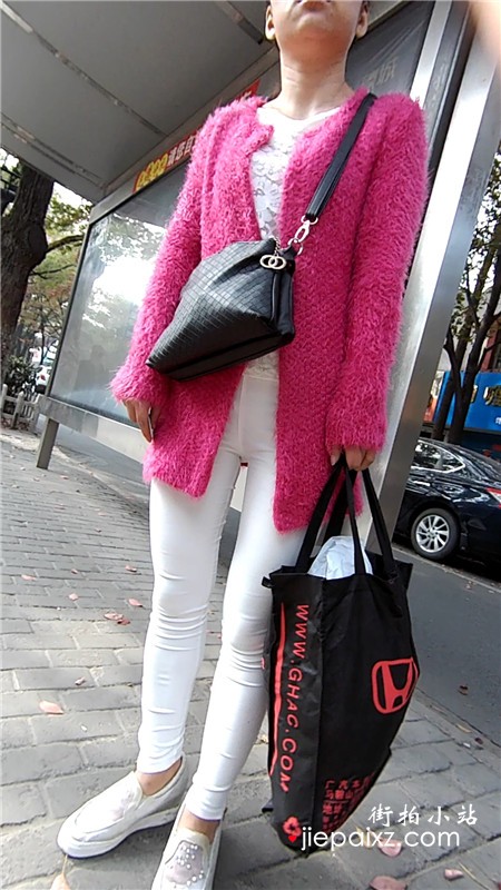 公交站等车的紧身白裤白鞋美眉
