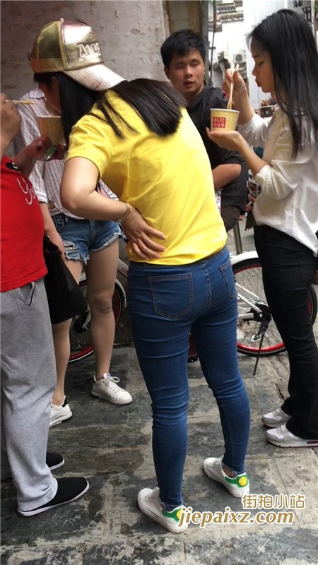 街拍紧身蓝牛黄T恤鸭舌帽小姐姐