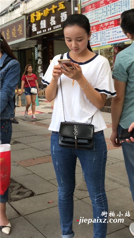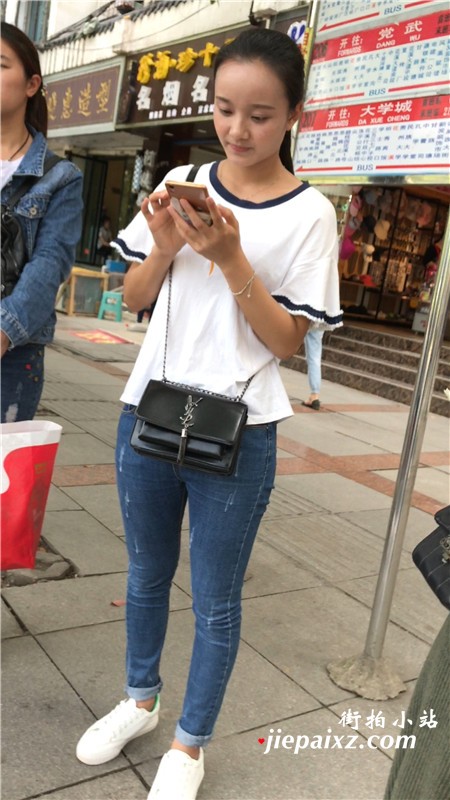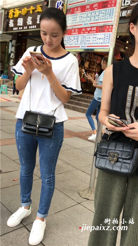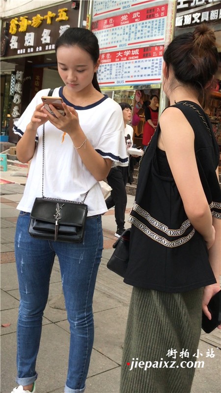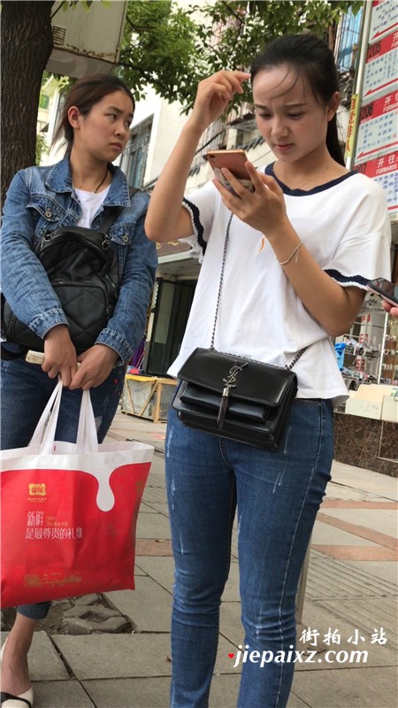 白T恤紧身蓝牛妹子在等公交车,旁边黑衣女孩很抢镜