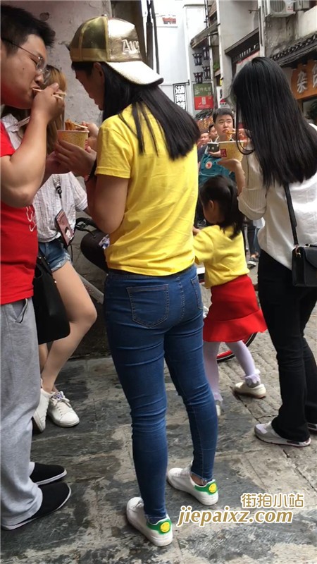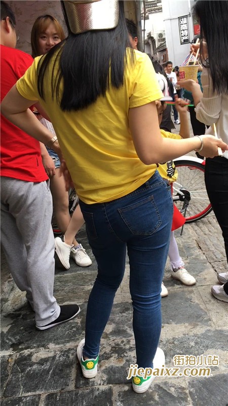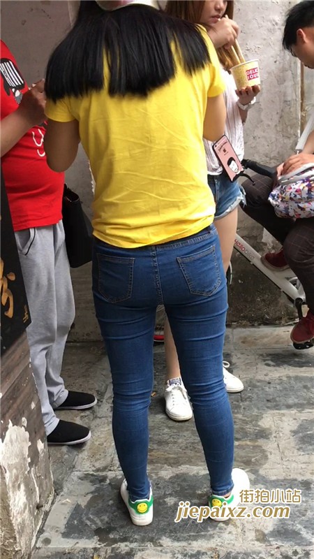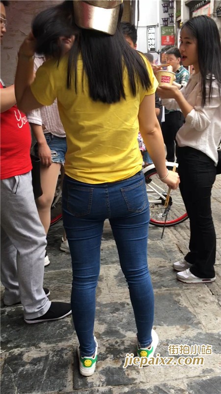 街拍紧身蓝牛黄T恤鸭舌帽小姐姐
