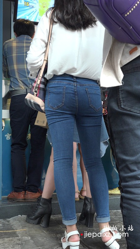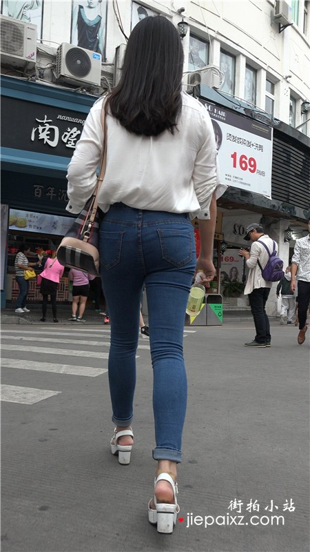 4K - 紧身蓝色牛仔裤白衬衫好身材街拍美女姐姐美臀