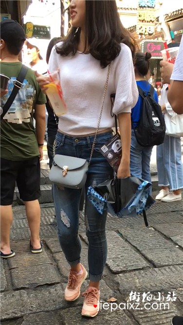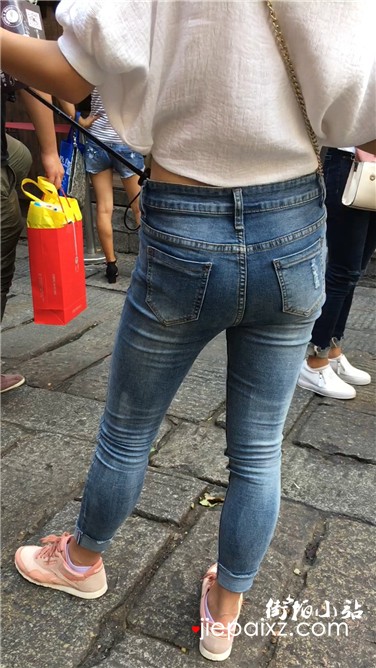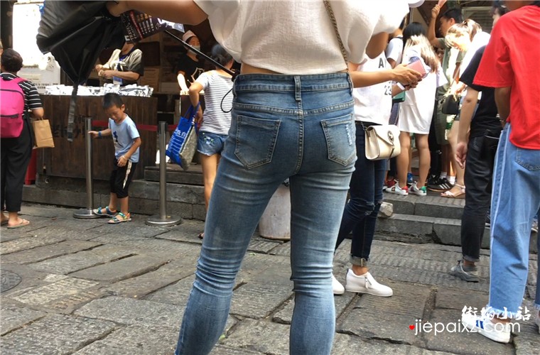 街拍紧身蓝色牛仔裤小清新气质姐姐