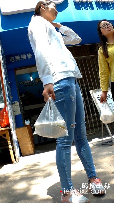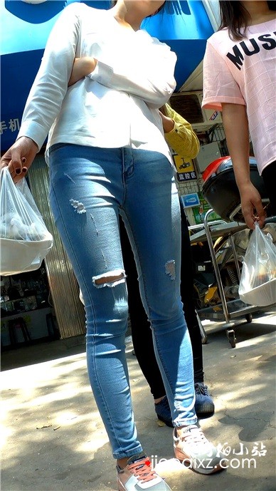 蓝色紧身牛仔裤长腿运动鞋妹子